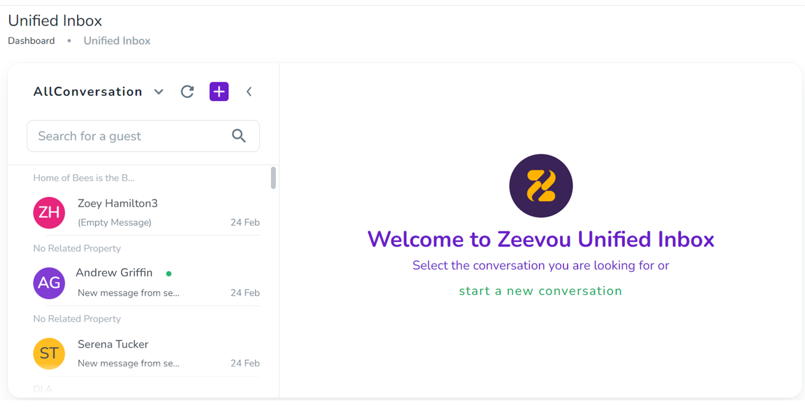 All communications, both incoming and outgoing, are displayed in a timeline within the property management unified inbox conversation view. Additionally, relevant booking details are conveniently shown on the right side for quick access, allowing you to respond to guests more efficiently.