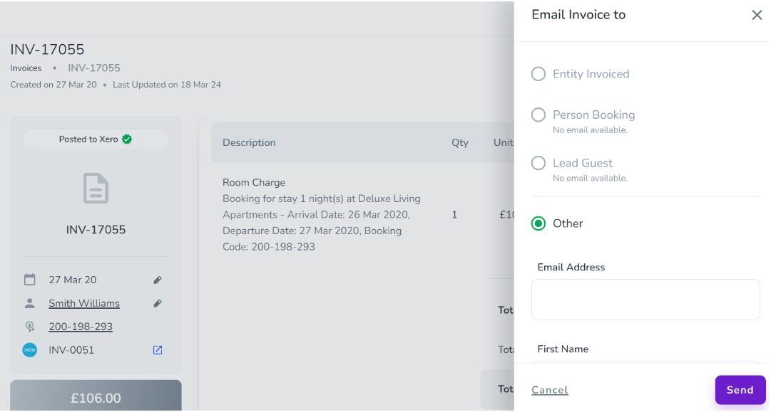 Pasi një mysafir shënohet si i larguar nga rezervimi, mund të lëshohet një faturë përfundimtare për mysafirin. Nga ana e kontabilitetit, kjo do të marrë në konsideratë detajet se nga cili kanal erdhi rezervimi (dhe kostot përkatëse), si dhe se cilës marrëveshje investitori i është caktuar në Zeevou (për të lejuar automatizimin e kohës reale). deklaratat e pronarit ).