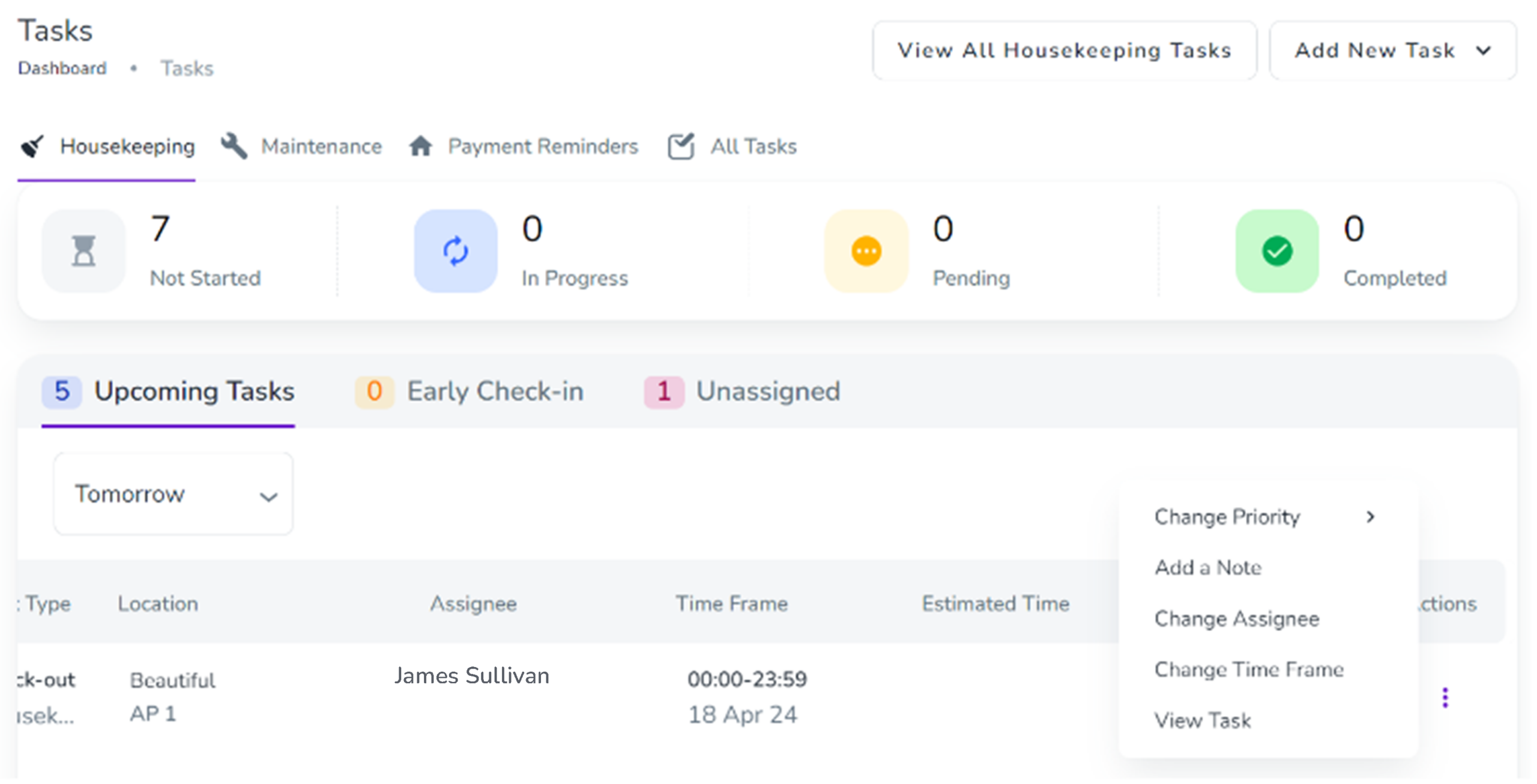 Zeevou gjeneron automatikisht detyra pastrimi për largimet nga hoteli dhe pastrimet në mes të qëndrimit , duke siguruar menaxhim efikas të pastrimit.. Mund të caktoni disponueshmërinë e çdo pastruesi dhe ta lidhni atë me pronat e preferuara. Algoritmi ynë i caktimit cakton detyrat duke marrë parasysh disponueshmërinë e pastruesit, oraret e largimit dhe të regjistrimit, kohëzgjatjen e pastrimit dhe kohën e udhëtimit midis pronave.