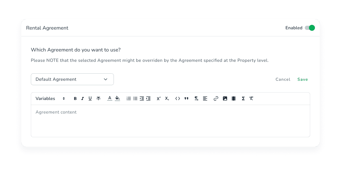 Pritësit mund të shkruajnë përmbajtjen e tyre të personalizuar për marrëveshjen e qirasë me nënshkrim elektronik. Ata mund të vendosin variabla dinamikë si emri i mysafirit, datat e hyrjes/daljes dhe detaje të tjera të rezervimit dhe pronës. Një skedar PDF i dokumentit do të dërgohet pasi mysafiri të nënshkruajë marrëveshjen.